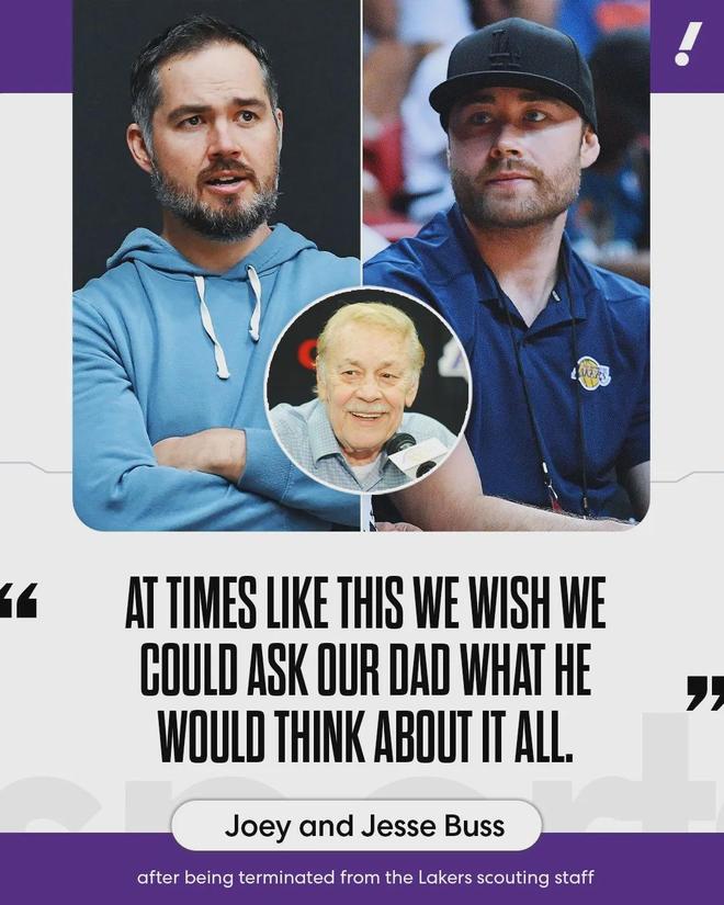 过去10年,这哥俩一直掌管着湖人运营部和球探部门。帮助湖人发掘了里夫斯、克拉克森、库兹马、小南斯等球员。杰西-巴斯发声明表达不满:“我和乔伊掌管运营部,是父亲巴斯博士的想法。如今珍妮保留职位,她的兄弟全被解雇了。”